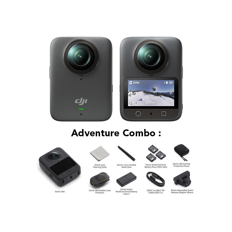 Capture cinema-quality 360° video and 8K stills with the ultracompact Osmo 360 Action Camera from DJI. This powerful entry into the Osmo camera line provides dual lenses for full 360° views and a large 1″ sensor that captures up to 8K30 video and 120MP stills with exceptional low-light performance. Its bright 2″ touchscreen provides clear previews and easy touch controls.