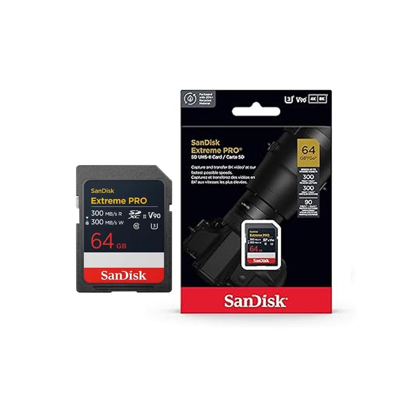 Achieve pro-level performance with the 64GB Extreme PRO UHS-II SDXC Memory Card from SanDisk, which lets users capture 8K, 4K, and Full HD video as well as raw photos and continuous shutter bursts. This card features a storage capacity of 64GB and takes advantage of the UHS-II bus to support read and write speeds speeds of up to 300 MB/s. Thanks to the V90 Video Speed Class rating, write speeds are guaranteed not to drop below 90 MB/s.