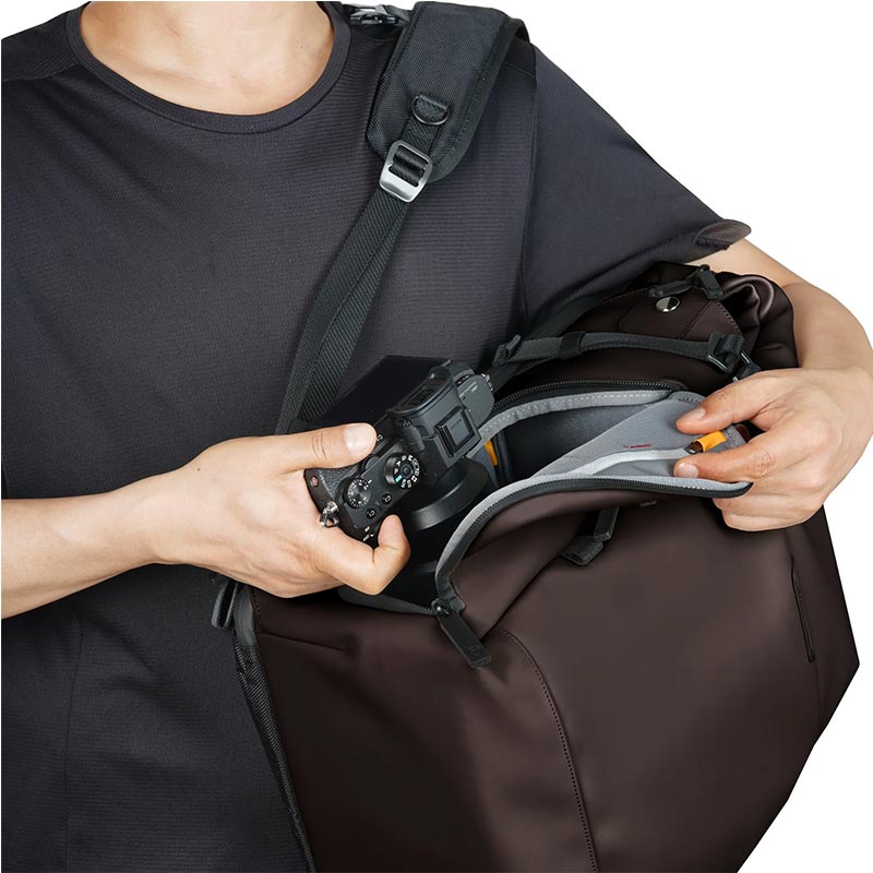 The surface is also easy to clean. Simply wipe off stains gently with a damp cloth. This backpack has a lower compartment for your camera gear and an upper compartment for your personal gear (or other camera gear). Full access to your camera compartment is via the back of the backpack. It is designed to carry a full-frame camera with an attached 70-200 mm f2.8 lens and three to four additional lenses and accessories. Use the quick, extra-wide side access to conveniently remove your camera and ensure you don’t miss a fleeting snapshot. The upper daypack compartment is ideal for stowing personal gear for a day trip or additional camera equipment. It can also be opened to access the entire backpack from the top.